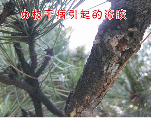 2、侵染性流胶: 侵染性流胶病菌随风传播,主要经伤口侵入,为害树木的枝干。病菌侵染当年生枝条,多从伤口和侧芽处入侵,出现以皮孔为中心的瘤状突起,当年不流胶,具有潜伏侵染特征,次年瘤皮开裂溢出胶液,发病后期病部表面生出大量梭形或圆形的小黑点,1年有2次高峰期,5月上旬至6月上旬1次,8月下旬至9月上旬1次,这是与生理性流胶的最大区别。