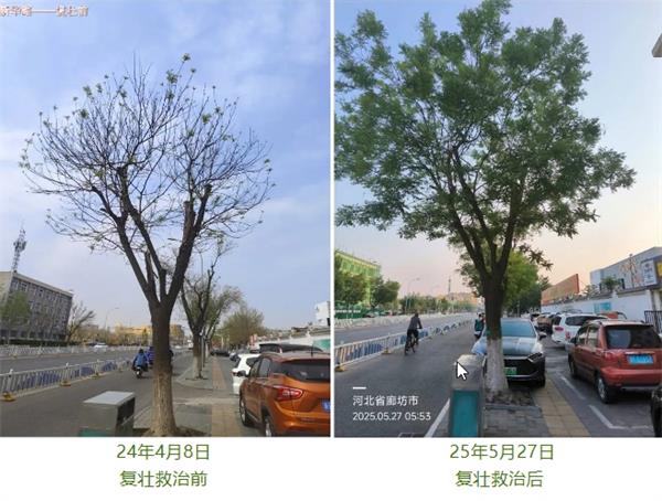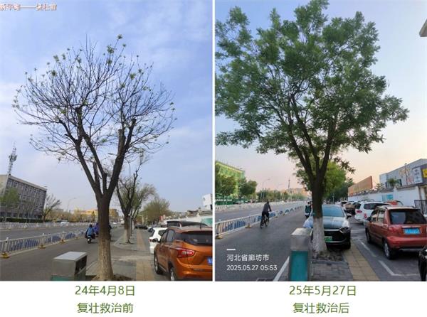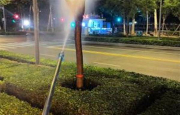 将微生物菌根肥“根飞扬”、矿源黄腐酸钾“琳海多亢”和杀菌药肥“琳海健安”混合使用。在原土球周围、复壮孔和树木滴水线位置,用施药枪注射混配好的药液。“根飞扬”中的益生菌能够促进根系的生长和发育,“琳海多亢”提供的有机质可以改良土壤结构,增强土壤肥力,“琳海健安”则持续发挥杀菌作用,三者协同作用,从根源上复壮国槐的长势。