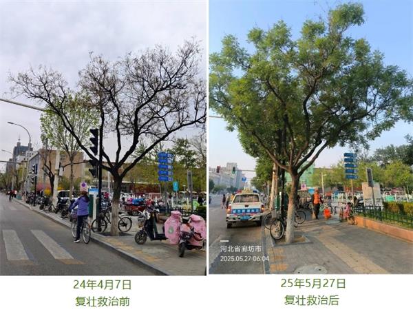 喷施枝干病害治疗药剂(奎福宁和杆秀)和植物生长调节剂(琳生活费碧护)。奎福宁和杆秀能够有效治疗枝干病害,如溃疡病、干腐病等;琳海碧护则可以调节植物的生长,促进枝条分蘖,增强国槐的生长活力,使国槐在恢复健康的同时,生长态势更加旺盛。